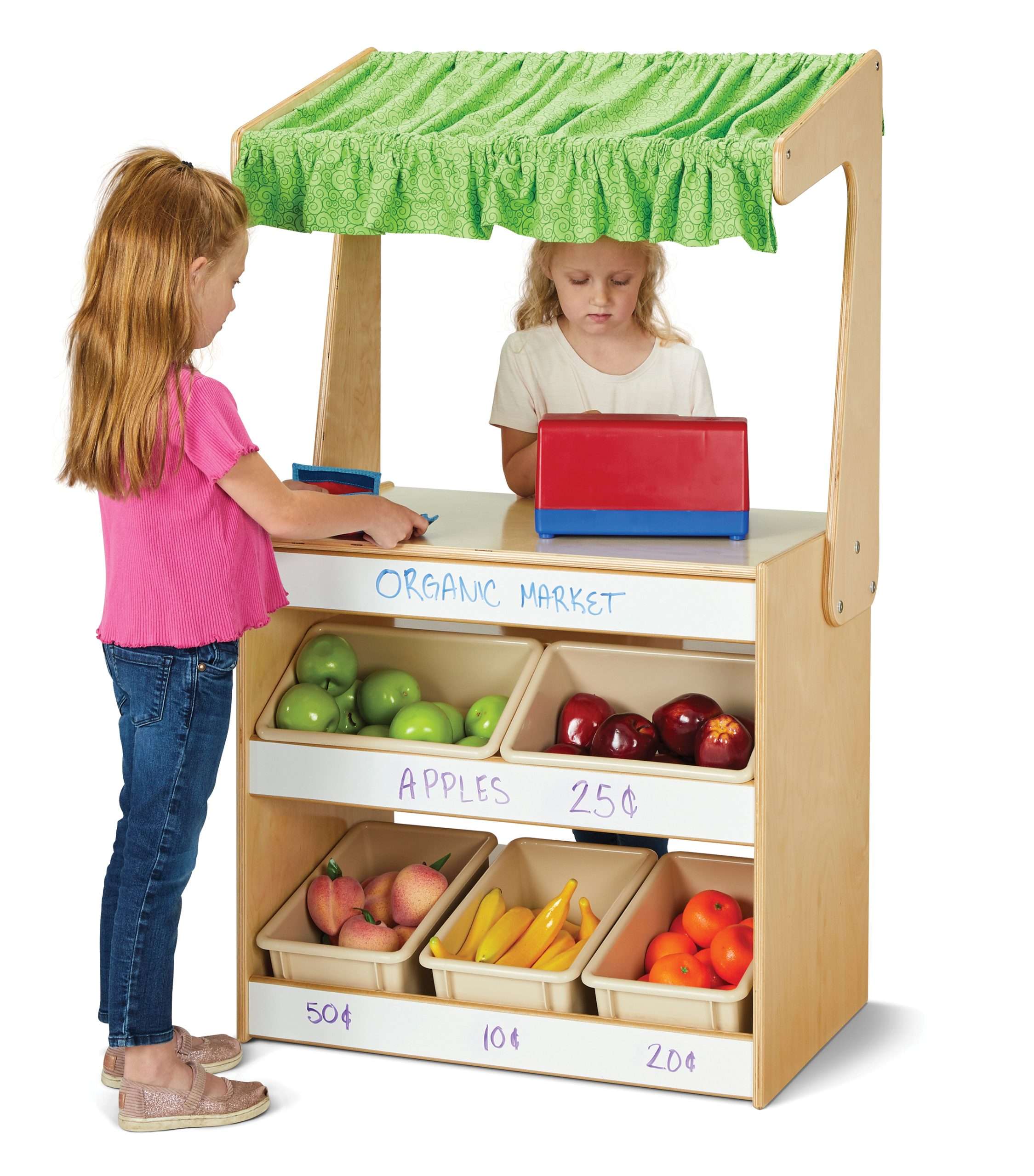 Add a fun way for children to learn about running a business, selling products, and even exchanging money with this Market Stand! This versatile unit can be used as a farmers market, a grocery stand, or a lemonade stand – it’s the perfect addition to any early learning space. Five included Cubbie-Trays are mounted at an angle to easily display items for sale and three Write-n-Wipe rails allow kids to name their store, announce specials, or display prices. It also features a brightly colored fabric canopy and multiple shelves in the back that can be used for storing a cash register or additional grocery items. The transaction counter height is 26” from the floor.